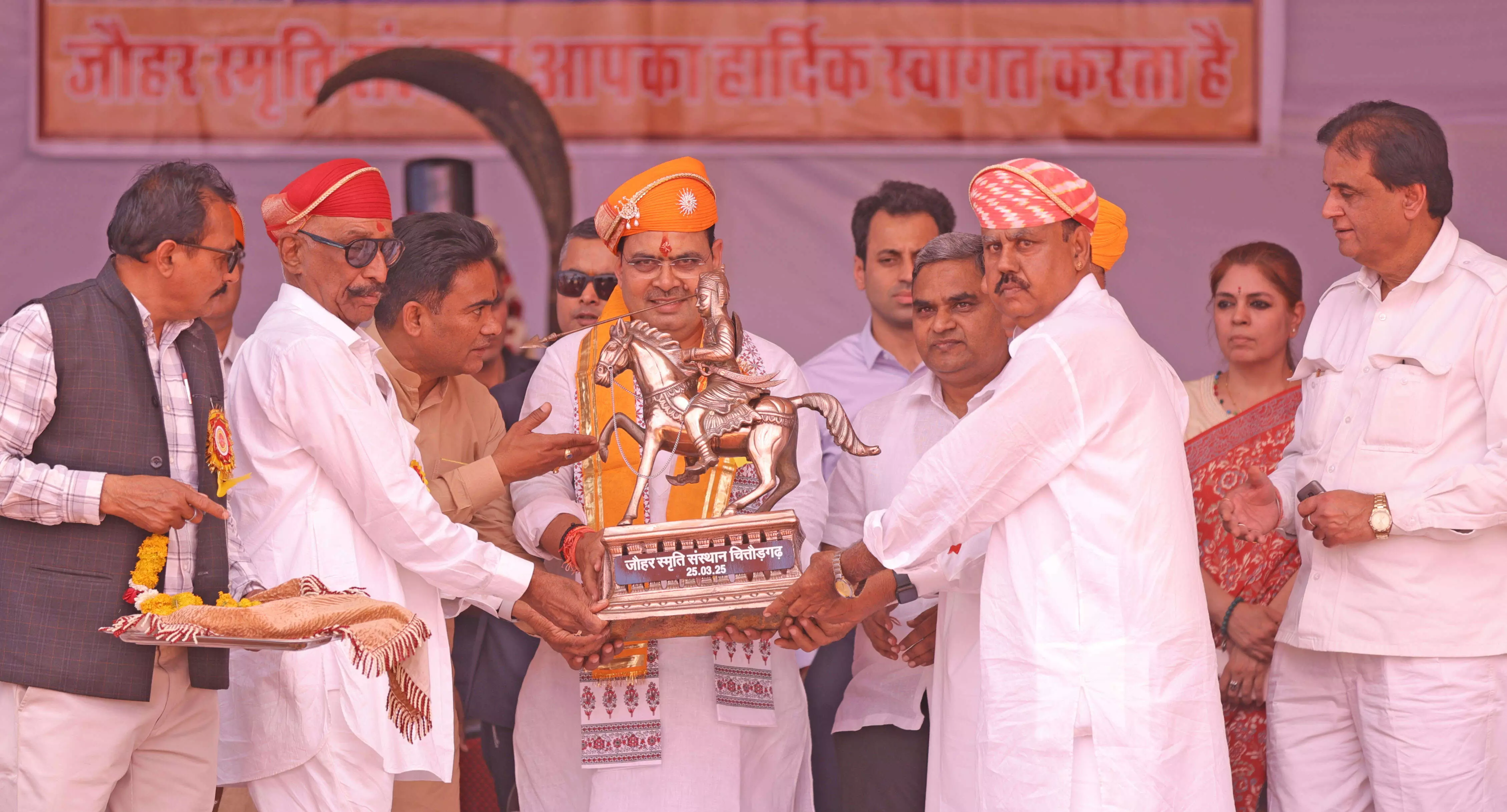 श्री शर्मा मंगलवार को चित्तौड़गढ़ में जौहर स्मृति संस्थान द्वारा आयोजित श्रद्धांजलि समारोह को संबोधित कर रहे थे। उन्होंने कहा कि आज हम यहां केवल श्रद्धांजलि देने नहीं आए हैं, बल्कि शौर्य और त्याग की भावना को अपने जीवन में उतारने का संकल्प लेने आए हैं। उन्होंने कहा कि चित्तौड़गढ़ दुर्ग राष्ट्रीय अस्मिता और सनातन संस्कृति का प्रतीक है। यह वह पवित्र भूमि है जहां क्षत्रिय वीर मर मिटने का अपना सौभाग्य मानते थे। मेवाड़ के राज्य चिन्ह में भी आदिवासी प्रतिनिधि का चित्र सामाजिक समरसता को दर्शाता है।