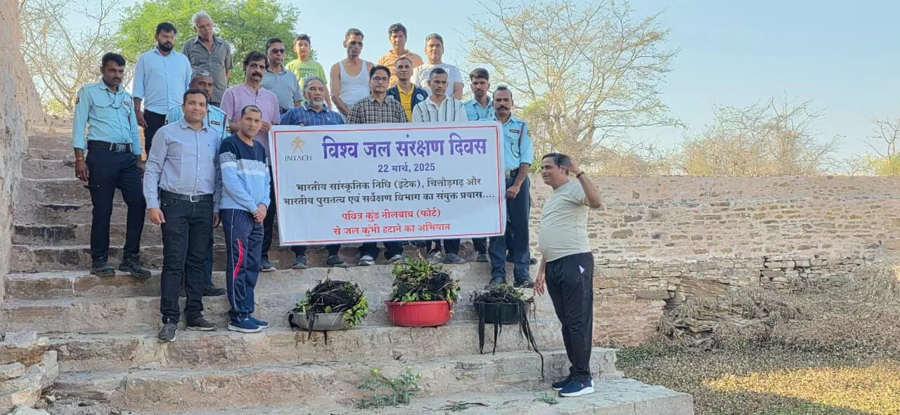 चित्तौड़गढ़ । विश्व जल संरक्षण दिवस के अवसर पर भारतीय सांस्कृतिक निधि परिषद, इंटेक् एवं भारतीय पुरातत्व सर्वेक्षण विभाग की जन सहभागिता से विश्व विरासत दुर्ग पर स्थित नील बाव कुंड में जलकुंभी हटाने का अभियान प्रारंभ किया गया| मीठे पानी के स्रोत को विकसित करने एवं संरक्षण को लेकर बड़ी संख्या में इंटेक् सदस्य ,पुरातत्व विभाग के अधिकारी एवं कर्मचारियों सहित स्थानीय युवाओं की जलकुंभी हटाने में सहभागिता रही| सभी ने अपने सामूहिक प्रयास के द्वारा सवेरे 8:00 से बजे यह कार्य प्रारंभ हुआ दो घंटे चले। इस श्रमदान में ढेर सारी जलकुंभी को बाहर निकाला गया ।