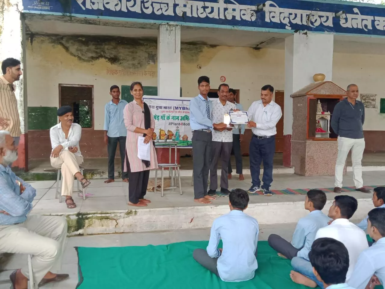 चित्तौड़गढ़ "एक पेड़ माँ के नाम" अभियान के अंतर्गत युवा कार्यक्रम एवं खेल मंत्रालय, भारत सरकार की जिला इकाई मेरा युवा भारत (MY Bharat), चित्तौड़गढ़ द्वारा पर्यावरण जागरूकता को बढ़ावा देने हेतु राजकीय उच्च माध्यमिक विद्यालय धनेत कलां और सेगवा में जागरूकता कार्यक्रमों का आयोजन विद्यालयों के सहयोग से किया गया। धनेत कलां विद्यालय में आयोजित कार्यक्रम की अध्यक्षता प्रधानाचार्य राजेन्द्र दाशोरा ने की, जिसमें प्रश्नोत्तरी एवं निबंध लेखन प्रतियोगिताएं आयोजित की गईं। क्विज़ में अजय बंजारा, प्रवीण शर्मा और देवकरण शर्मा क्रमशः प्रथम, द्वितीय व तृतीय स्थान पर रहे, वहीं निबंध लेखन में राहुल आहिर प्रथम, रिहान मंसूरी द्वितीय और देवराज रेगर तृतीय स्थान पर रहे। इस अवसर पर वक्ताओं देवेंद्र चौहान, रेणुका भट्ट, राजेन्द्र गगरानी, भंवर सिंह चौहान व कमलेश ने पर्यावरण संरक्षण व मातृत्व भाव पर प्रेरक विचार प्रस्तुत किए। इसी श्रृंखला में सेगवा विद्यालय में पर्यावरण एवं मातृ-संवेदना विषयक प्रश्नोत्तरी प्रतियोगिता आयोजित की गई, जिसमें जगदीश मोड़, स्नेह गाडरी व कुशाग्र बिलोची क्रमशः प्रथम, द्वितीय व तृतीय स्थान पर रहे और प्रधानाचार्य अनुराधा आर्य द्वारा पुरस्कार वितरित किए गए। कार्यक्रम के दौरान शारीरिक शिक्षक सूर्यप्रकाश गर्ग ने विद्यार्थियों को पौधारोपण हेतु पौधे वितरित किए, ताकि वे एक पेड़ अपनी माँ के नाम पर लगाकर इस अभियान को आगे बढ़ाएं। सुमन खोखर, ज्योति वाला ओझा समेत अन्य शिक्षकगण की उपस्थिति रही और अंत में महावीर प्रसाद शर्मा ने सभी का आभार व्यक्त करते हुए पर्यावरण संरक्षण में भागीदारी का आह्वान किया।