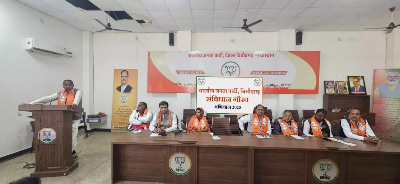 चित्तौड़गढ़ भारतीय जनता पार्टी जिला चित्तौड़गढ़ द्वारा संविधान गौरव दिवस "हमारा संविधान हमारा स्वाभिमान" संगोष्ठी का आयोजन मंगलवार को अहिंसा नगर, ओछड़ी स्थित जिला भाजपा कार्यालय पर भाजपा जिलाध्यक्ष मिठ्ठू लाल जाट के मुख्य आतिथ्य में हुआ। अध्यक्षता अभियान के संयोजक पूर्व विधायक अशोक नवलखा ने की। भाजपा जिला मीडिया प्रभारी मनोज पारीक ने बताया कि संगोष्ठी को संबोधित करते हुए भाजपा जिलाध्यक्ष मिठ्ठू लाल जाट ने कहा कि कांग्रेस ने संविधान के साथ कई बार विश्वासघात किया। बाबा साहब के बने संविधान के विरुद्ध देश में इमरजेंसी लागू की जो भारत के संविधान के लिए कलंक है। हमारा संविधान हमारा स्वाभिमान है। देश पूर्ण रूप से संविधान के अनुरूप चल रहा है। संविधान के साथ किसी तरह की कोई छेड़छाड़ नहीं की जा रही है यह बात स्वंय भारत के प्रधानमंत्री नरेंद्र मोदी एवं गृह मंत्री अमित शाह ने कही। हम संविधान की बनी रूपरेखा पर चलकर सशक्त भारत व विकसित भारत बनाने का लक्ष्य लेकर चल रहे हैं। उन्होंने कहा कि आज विपक्ष के द्वारा भ्रांति फैला कर प्रचारित किया जा रहा है कि संविधान को भारतीय जनता पार्टी बदलेगी। मगर ऐसी कोई बात नहीं है। संविधान निर्माता बाबा साहब को अगर सच्चे देशभक्ति का दर्जा दिया तो वह भारतीय जनता पार्टी है। बाबा साहब को मान सम्मान भाजपा द्वारा ही दिया गया। अपने आप को संविधान हितैषी बताने वाली कांग्रेस पार्टी बताए कि इस देश मे ज्यादातर समय तक शासन करने के दौरान वो बाबा साहब अम्बेडकर को भारत रत्न क्यों नहीं दे पाई। उन्होंने आरोप लगाया कि उस समय के लोकसभा चुनावों के दौरान उन्होंने भीम राव अम्बेडकर के खिलाफ प्रत्याशी क्यों मैदान में उतारा और वो लोकसभा चुनाव ना जीत पाए इसे लेकर तरह तरह के कुचक्र उनके विरुद्ध क्यों चलाये? अभियान के जिला संयोजक पूर्व विधायक अशोक नवलखा ने संविधान गौरव दिवस की जानकारी देते हुए संविधान के बारे में विस्तृत जानकारी दी। अभियान के तहत आगामी कार्यक्रम एवं योजना के बारे में भी बताया। नवलखा ने कहा कि अभियान के माध्यम से पार्टी पदाधिकारी आमजन को यह समझाने का प्रयास करेंगे कि संविधान और दलितों अधिकारों की असली रक्षक भाजपा है। संगोष्ठी का संचालन करते हुए जिला महामंत्री रघु शर्मा ने कहा कि डॉ. अंबेडकर का अपमान जितना कांग्रेस पार्टी ने किया उतना किसी ने नहीं किया। बाबा साहेब अंबेडकर को अगर वास्तव में सम्मान दिया तो वो भाजपा शासनकाल मे दिया गया। अटल जी की सरकार के समय देश का सर्वोच्च सम्मान ''भारत रत्न'' अवार्ड बाबा साहब को भाजपा सरकार ने ही दिया। वहीं भाजपा की मोदी सरकार ने बाबा साहब की जन्म और कर्म भूमि में उनके सम्मान में विशाल स्मारक का निर्माण करवाकर उनको सच