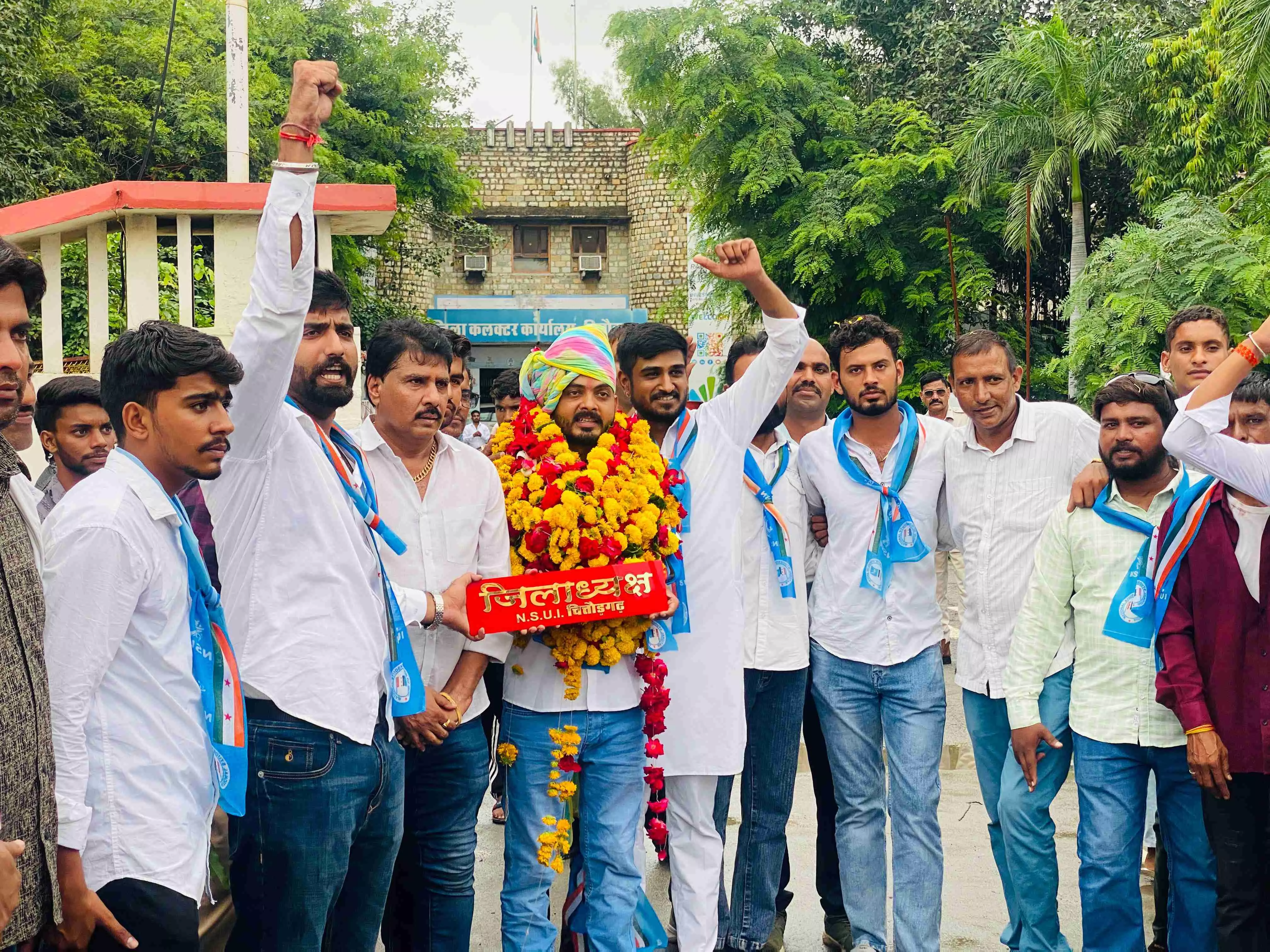 चित्तौडगढ । एन एस यू आई जिलाध्यक्ष (कार्यकारी) के रूप में हुई ताजपोशी के बाद नरपत की खेड़ी पुलिया से एनएसयूआई कार्यकर्ताओं और वाहनों के काफिले के साथ संजय राव का कलेक्ट्रेट चौराहे पर पीसीसी सदस्य प्रमोद सिंह सिसोदिया के नेतृत्व में भव्य आतिशबाजी और ढोल की थाप के बीच दो जेसीबी मशीनों द्वारा पुष्प वर्षा कर भव्य स्वागत किया गया। सभी उपस्थित कांग्रेस कार्यकर्ताओं ने नवनियुक एनएसयूआई जिलाध्यक्ष (कार्यकारी) संजय राव और एक दूसरे को मिठाई खिलाकर खुशी जताई।
