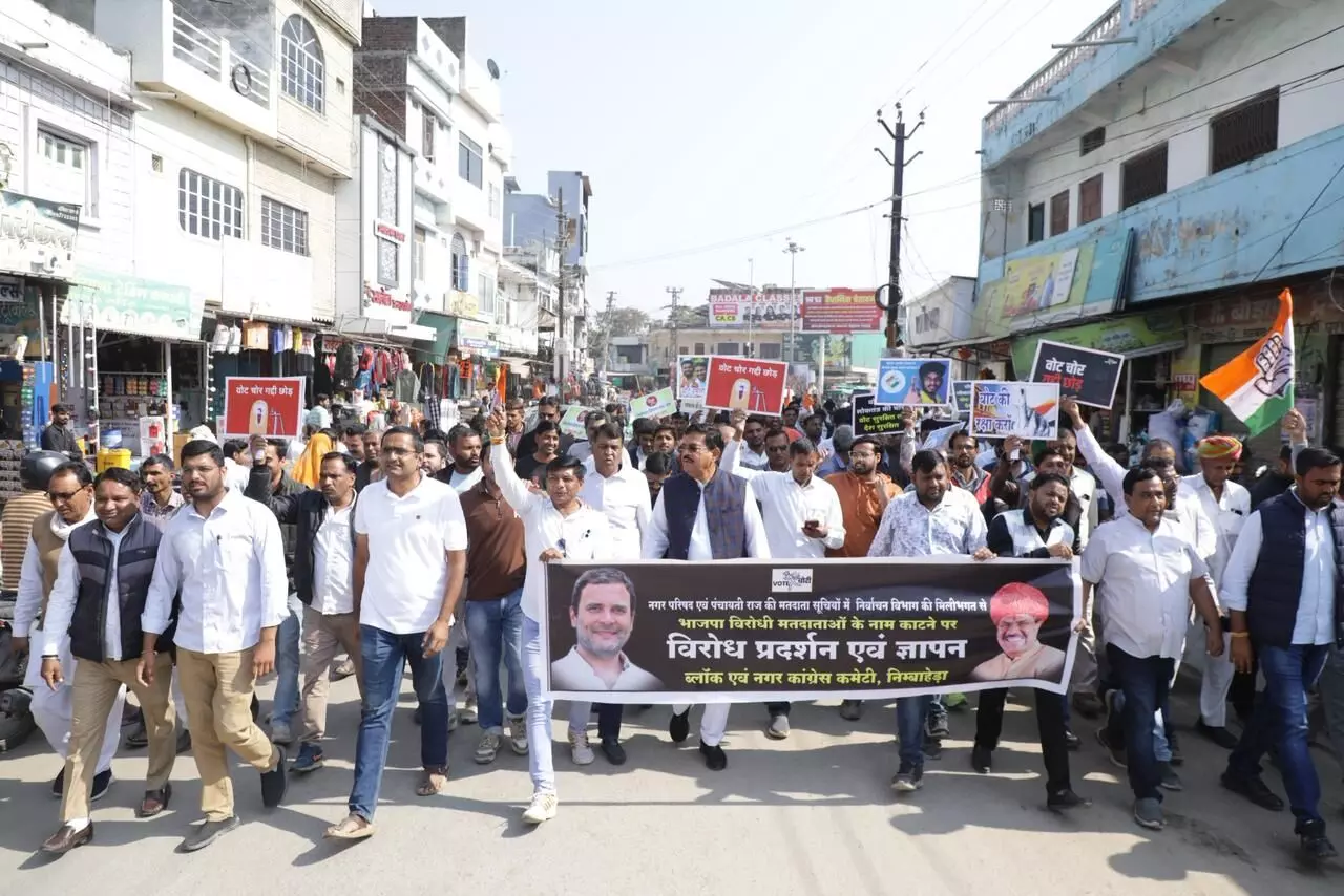 निंबाहेड़ा,|निंबाहेड़ा में मतदाता सूची में कथित गड़बड़ियों और वोटरों के अधिकारों को प्रभावित करने के आरोपों को लेकर कांग्रेस ने जोरदार विरोध प्रदर्शन किया। पूर्व सहकारिता मंत्री उदयलाल आंजना के नेतृत्व में ब्लॉक और नगर कांग्रेस कार्यकर्ताओं ने पेच परिसर स्थित कांग्रेस कार्यालय से उपखंड कार्यालय तक पैदल मार्च निकाला और राज्य निर्वाचन आयुक्त के नाम ज्ञापन सौंपा।
