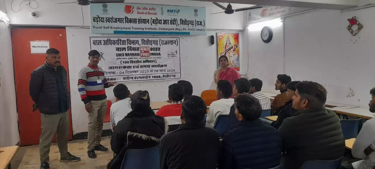 इसी क्रम में सहायक निदेशक बाल अधिकारिता विभाग ओमप्रकाश तोषनीवाल के निर्देशानुसार चाइल्ड हेल्पलाइन टीम द्वारा बड़ौदा स्वरोजगार विकास संस्थान में वीडियोग्राफी का प्रशिक्षण प्राप्त कर रहे प्रशिक्षकों को बाल विवाह की सामाजिक कुरीतियों के प्रति जागरूक किया गया तथा बाल विवाह के विरुद्ध शपथ दिलवाई गई।