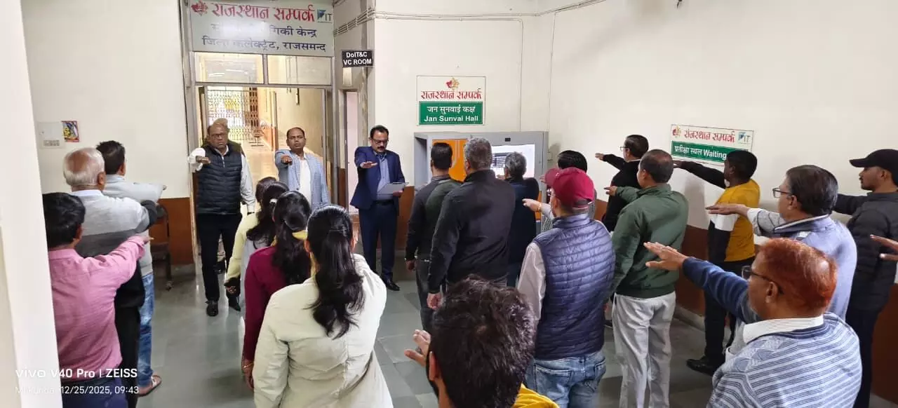 जिला स्तरीय मुख्य कार्यक्रम कलेक्ट्रेट परिसर स्थित डीओआईटी वीसी कक्ष में आयोजित हुआ, जहां जयपुर में मुख्यमंत्री भजनलाल शर्मा के मुख्य आतिथ्य में आयोजित राज्य स्तरीय कार्यक्रम का सीधा प्रसारण देखा गया। मुख्यमंत्री ने वर्चुअल माध्यम से प्रदेशभर के जनप्रतिनिधियों, अधिकारियों एवं कार्मिकों को सुशासन की शपथ दिलाई।