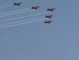 परफेक्ट फॉर्मेशन: 9 विमानों का दस्ता 1000 फीट की ऊंचाई पर सटीकता और गति का बेजोड़ प्रदर्शन कर रहा है।