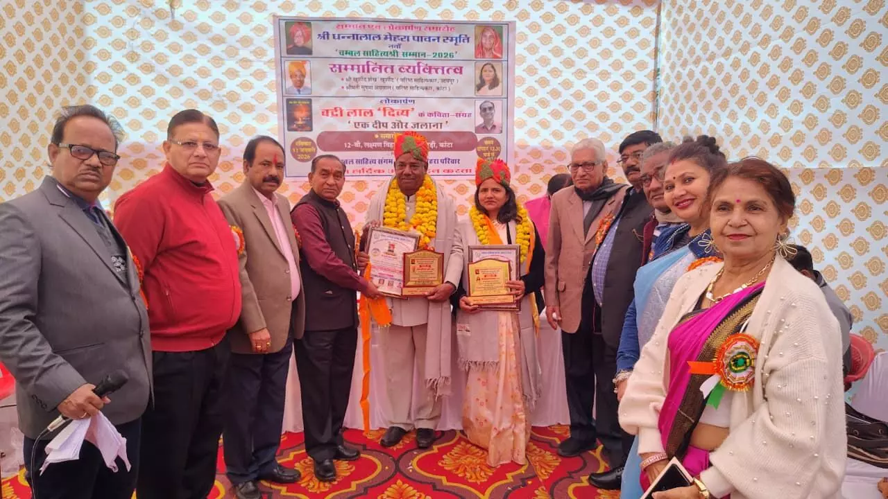 उदयपुर, । चम्बल साहित्य सम्मान मिलने पर शहर के शायर खुर्शीद शेख 'खुर्शीद' को शहर के साहित्यकारों, साहित्य रसिकों एवं शायरों ने बधाइयां दी है। हाल ही में कोटा के चम्बल साहित्य संगम की ओर से धन्ना लाल मेहरा की स्मृति में आयोजित नवें चम्बल साहित्य सम्मान-2026 से उदयपुर के शायर और अदबी उड़ान के प्रकाशक ख़ुर्शीद शेख 'ख़ुर्शीद' को शॉल, फल, पगड़ी, उपरना, सम्मान-पत्र एवं नकद राशि देकर सम्मानित किया गया था। कोटा के कुन्हाड़ी में आयोजित सम्मान समारोह में कवि बद्री लाल दिव्य के आठवें कविता संग्रह 'एक दीप और जलाना' तथा अदबी उड़ान पत्रिका के 41 वें अंक सुनहरा भारत विशेषांक का लोकार्पण भी किया गया। इस अवसर पर संभाग के प्रमुख ख्यातनाम रचनाकार किशन लाल वर्मा, मुकुट मणिराज, जितेन्द्र निर्मोही, बाबू बंजारा, चाँद शेरी, रामेश्वर शर्मा, महेन्द्र नेह, गोरस परचण्ड, आर. सी. आदित्य, रामकरण प्रभाती, हंसराज चौधरी, मयंक सोलंकी, विष्णु विश्वास, राजेन्द्र पंवार, मुरलीधर गौड़, सुरेश पण्डित, विष्णु हरिहर, जगदीश निराला, दिनेशराय द्विवेदी, कमलेश कमल,घाँसी लाल पंकज, महावीर मेहरा, पवन गौतम, सत्येन्द्र वर्मा, महेश पंचोली, दुर्गाशंकर बैरागी, रुपनारायण संजय आदि उपस्थित रहे।