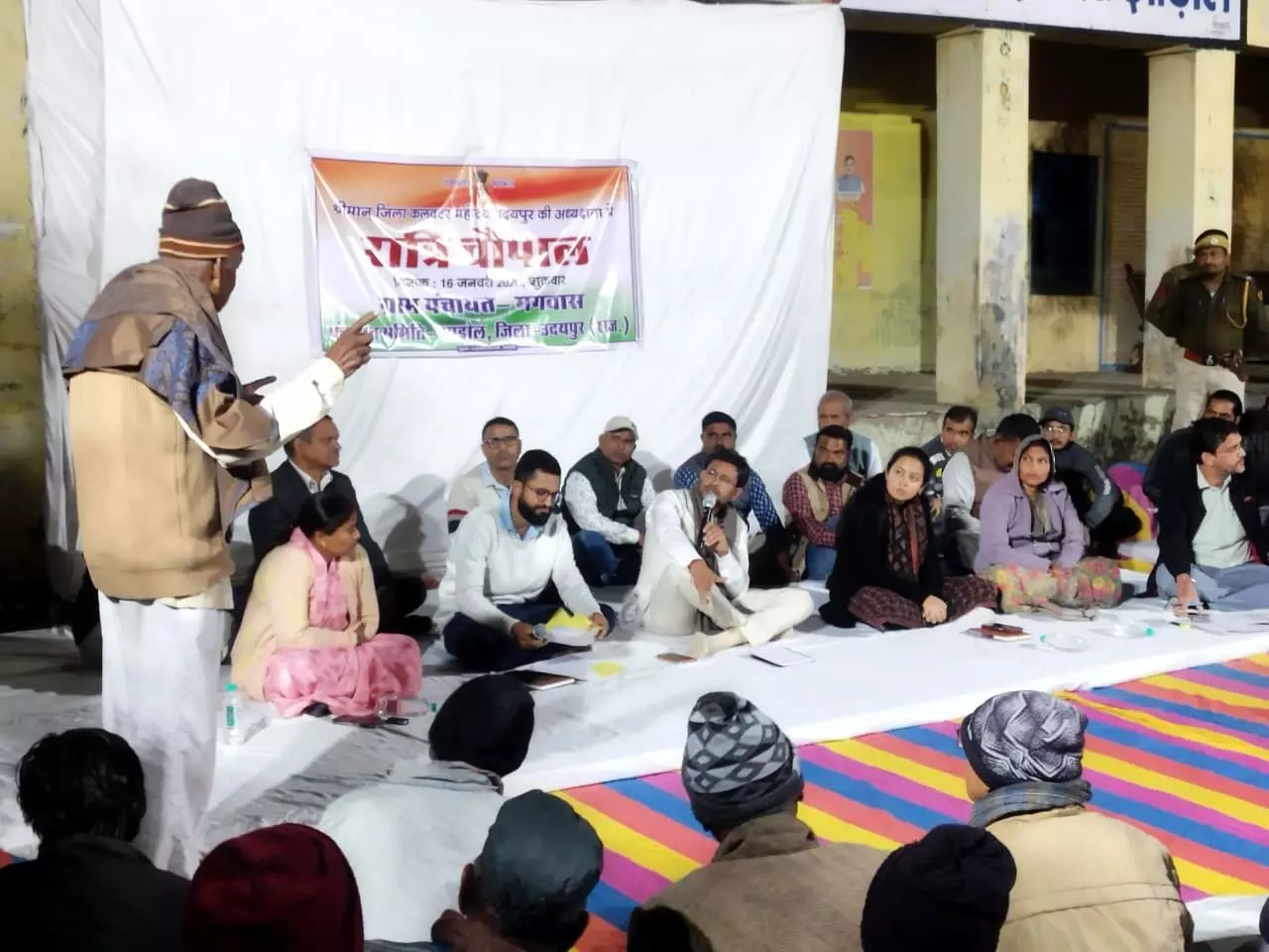 रात्रि चौपाल में जिला परिषद सीईओ रिया डाबी, झाड़ोल एसडीएम कपिल कोठारी, तहसीलदार सीताराम बोलीवाल, बीडीओ जितेंद्र सिंह राजावत, एवीवीएनएल एसई के आर मीणा, सीएमएचओ डॉ अशोक आदित्य, पीएचईडी एसई रविन्द्र चौधरी, आईसीडीएस उपनिदेशक नंदलाल मेघवाल, जिला शिक्षा अधिकारी माध्यमिक लोकेश भारती सहित विभिन्न विभागों के जिला एवं उपखण्ड स्तरीय अधिकारी मौजूद रहे।