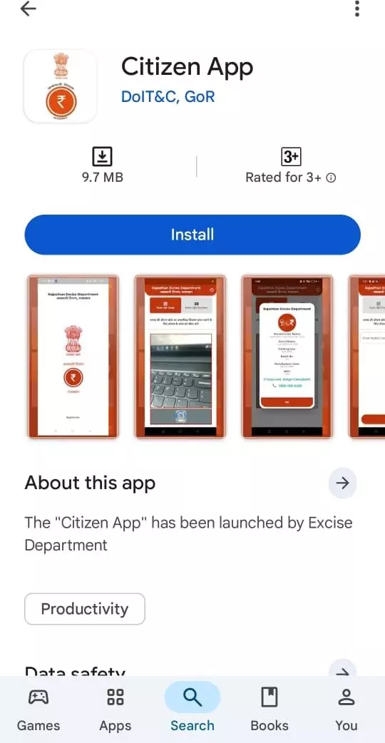 आबकारी विभाग के ‘‘सिटीजन ऐप’’ (ब्पजप्रमद ।चच) मोबाईल ऐप को एंड्रायड मोबाईल यूजर कोई भी व्यक्ति गूगल प्ले स्टोर के माध्यम से डाउनलोड कर उपयोग कर सकता है। इसी क्रम में गूगल सर्च में पमउे 2.0 सर्च करने पर प्रदर्शित क्यूआर कोड को स्केन कर वांछित अनुमति प्रदान कर डाउनलोड कर उपयोग में लिया जा सकता है। आबकारी विभाग की वेबसाईट पमउेण्तंरेंजींदण्हवअण्पद के मुख पृष्ट पर स्केन क्यूआर कोड टू डाउनलोड सिटीजन ऐप के क्यूआर कोड लिंक को स्केन करने पर भी मोबाईल के माध्यम से उक्त ऐप को डाउनलोड कर उपयोग किया जा सकता है।