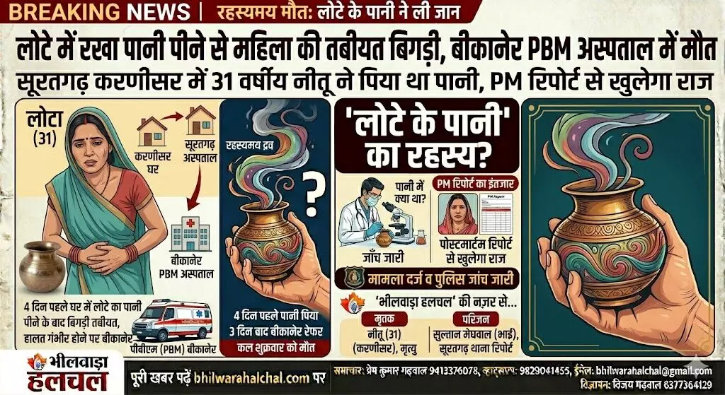 पुलिस के अनुसार, मृतका नीतू (31) निवासी करणीसर ने करीब चार दिन पूर्व अपने घर में लोटे में रखा पानी पिया था। पानी पीने के कुछ ही देर बाद उसकी तबीयत अचानक खराब होने लगी। परिजनों ने उसे तत्काल सूरतगढ़ के सरकारी अस्पताल में भर्ती कराया, जहाँ चिकित्सकों ने उसे बचाने का भरसक प्रयास किया, लेकिन उसकी हालत में कोई सुधार नहीं हुआ।