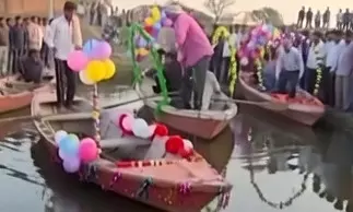भीलवाड़ा में अनोखी बारात, तालाब के रास्ते सात सजी नावों में पहुंचा दूल्हा