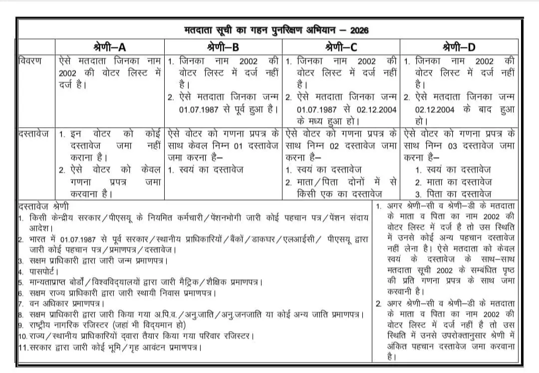 जहाजपुर (मोहम्मद आज़ाद नेब) चुनाव आयोग द्वारा आगामी मतदाता सूची के गहन पुनरीक्षण अभियान 2026 के तहत चार श्रेणियों में मतदाताओं का वर्गीकरण करते हुए आवश्यक दस्तावेजों की सूची जारी की गई है। यह दिशा-निर्देश उन नागरिकों के लिए अत्यंत महत्वपूर्ण हैं जो पहली बार मतदाता सूची में नाम जुड़वाना चाहते हैं या किसी कारणवश पूर्व सूची में शामिल नहीं हो सके।