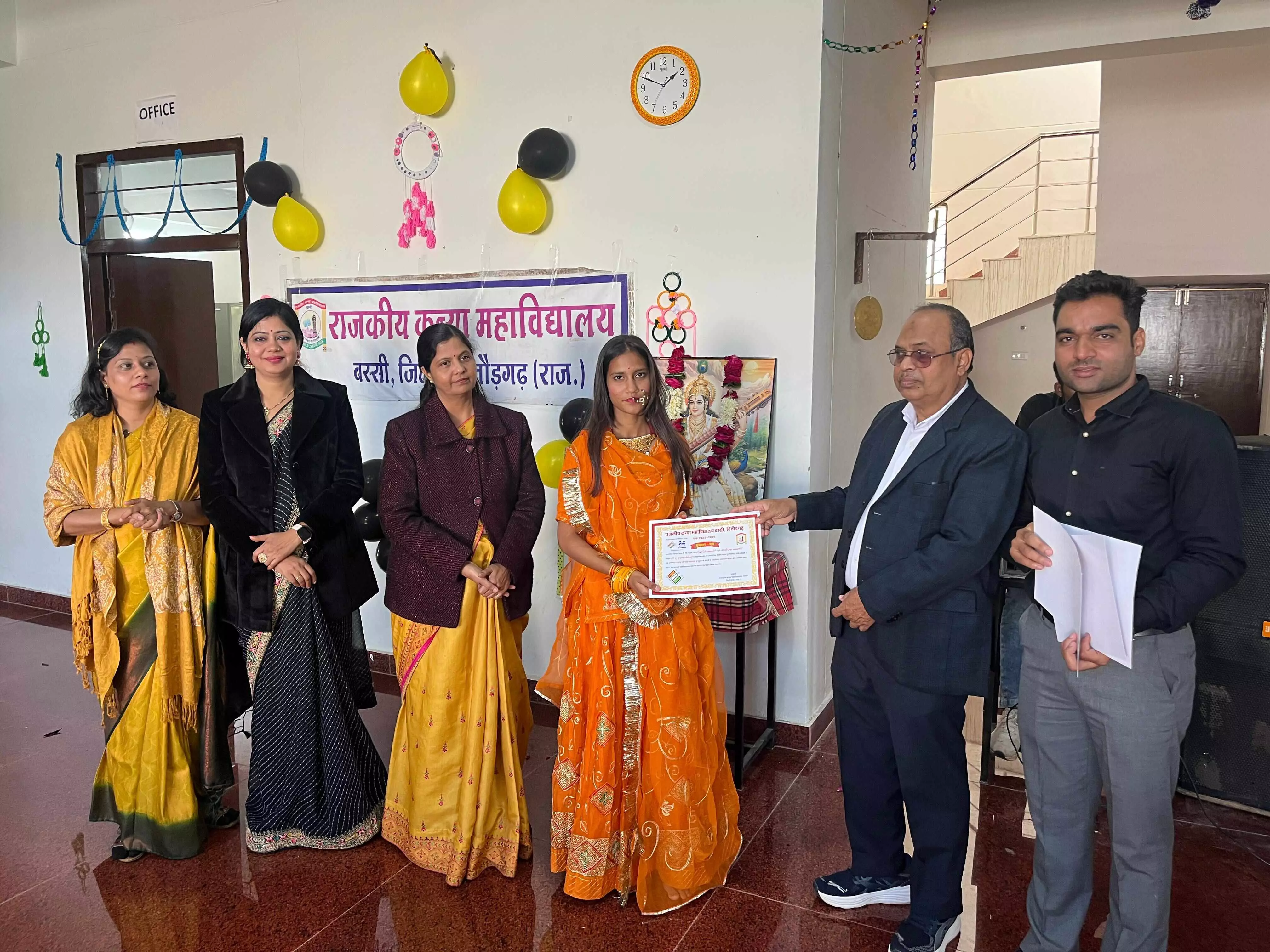 बस्सी |राजकीय कन्या महाविद्यालय बस्सी में बड़ी धूमधाम से वार्षिक उत्सव मनाया गया| कार्यक्रम के प्रारंभ में प्राचार्य डॉ. मनीषा बटवाल ने विद्यादायिनी सरस्वती के चित्र पर माल्यार्पण कर दीप प्रज्वलित करके कार्यक्रम का विधिवत शुभारंभ किया | इसी दौरान उमा समूह ने सरस्वती वंदना प्रस्तुत की | महाविद्यालय के प्रांगण में आयोजित सांस्कृतिक कार्यक्रम में एकल नृत्य, युगल नृत्य,पत्र वाचन एवं विभिन्न सांस्कृतिक प्रतियोगिताओं के माध्यम से छात्राओं ने मनमोहक प्रस्तुतियां दी | जानकारी देते डॉ. गोपाल सालवी ने बताया कि कल 22 दिसम्बर विभिन्न खेल प्रतियोगिताओं का भी आयोजन किया गया और आज महाविद्यालय की छात्राओं ने विभिन्न सांस्कृतिक प्रतियोगिता के साथ वार्षिक उत्सव मनाया। और बताया कि चेयररेस में प्रथम स्थान पर टीपू कॅवर, द्वितीय अंजलि तेली, एंव तृतीय स्थान पर ज्योति रही। रूमाल झपट्टा में प्रथम स्थान पर किरण बैरागी, द्वितीय राधा कॅवर चैहान एंव तृतीय दीपिका सेन रही। चम्मच रेस में प्रथम स्थान पर उमा बैरागी, द्वितीय किरण बैरागी तथा तृतीय नेहा मेंवाडा रही। इसी दौरान विभिन्न प्रतियोगिताओं में विजयी छात्राओं को प्रशस्ति पत्र देकर सम्मानित किया गया | इसी दौरान मुख्य अतिथि प्राचार्य डॉ. मनीष बटवाल ने अपने उद्बोधन में छात्राओं को चौमुखी विकास के लिए शिक्षा की आवश्यकता को बताते हुए प्रेरित किया और जीवन में कौशल आधारित शिक्षा पर जोर देने की बात कही| साथ ही यह भी बताया कि छात्राओं को शिक्षा के साथ-साथ सहशैक्षणिक गतिविधियों में भी बढचढ कर भाग लेने के लिये कहा| साथ ही प्रतियोगिता परीक्षाओं में कैसे तैयारी करें इस पर महत्वपूर्ण सुझाव दिए| और बताया कि सांहित्यिक प्रतियोगिता के पत्रवाचन में प्रथम स्थान पर पुष्पा बैरवा द्वितीय स्थान पर दो छात्राऐं सुुष्मिता सेन एंव चन्दा रेगर तृतीय स्थान पर जाहिरा रही। एकल नृत्य में प्रथम स्थान पर प्रिति सुवालका द्वितीय किरण बैरागी तथा तृतीय स्थान पर राधा चैहान रही। समूह नृत्य में प्रथम स्थान पर पायल एंव समूह द्वितीय उमा एंव समूह तृतीय स्थान पर दीपिका सेन एंव समूह रही। प्रतियोगिता में निर्णायक मंडल की भूमिका डाॅ. कुुसुम टेपण एंव डाॅ. पूर्वा दशोरा एंव मोहित कारवाल ने निभाई| महाविद्यालय में महिन्द्रा ग्रुुप द्वारा संचालित कौशल विकास कार्यक्रम में उत्कृष्ट प्रदर्शन करने के लिए अनुुष्का आचार्य, सुुष्मिता सेन, पायल चुण्डावत को सम्मानित किया।