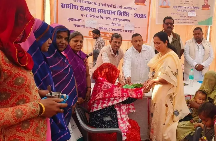 बनेड़ा (हेमराज तेली) राज्य सरकार के कार्यकाल के दो वर्ष पूर्ण होने के उपलक्ष में शुक्रवार को तहसील बनेड़ा के भू-अभिलेख निरीक्षक वृत्त मुख्यालय उपरेडा में ग्रामीण सेवा शिविर के फॉलोअप शिविर का भव्य आयोजन किया गया। इस शिविर में उपखंड स्तरीय अधिकारियों की मौजूदगी में आमजन की समस्याओं का मौके पर ही समाधान किया गया। शिविर प्रभारी एवं विकास अधिकारी धर्मपाल परसोया ने मौके पर ही उपडाकघर उपरेडा के लिए 2500 वर्गफीट का नि:शुल्क पट्टा जारी कर वितरित किया। विभाग द्वारा गोदभराई, शाला पूर्व शिक्षा प्रवेशोत्सव और अन्नप्राशन जैसे महत्वपूर्ण कार्यक्रम आयोजित किए गए। चिकित्सा विभाग की ओर से ग्रामीणों को निक्षय पोषण किट और आयुष्मान आरोग्य कार्ड वितरित किए गए। शिविर के दौरान उपखण्ड अधिकारी और शिविर प्रभारी धर्मपाल परसोया ने पूर्व में आयोजित मुख्य शिविरों के बकाया प्रकरणों की समीक्षा की। विकास अधिकारी ने सभी विभागों के अधिकारियों व कार्मिकों को लंबित मामलों के त्वरित निस्तारण के लिए पाबंद किया। साथ ही, शिविर से अनुपस्थित रहने वाले अधिकारी-कर्मचारियों के प्रति कड़ा रुख अपनाते हुए उन्हें कारण बताओ नोटिस जारी करने के निर्देश दिए। इस अवसर पर तहसीलदार संतोष सुनारीवाल, विभिन्न जनप्रतिनिधि और समस्त ब्लॉक स्तरीय अधिकारी व कर्मचारी उपस्थित रहे। ग्रामीण सेवा शिविरों की इस कड़ी में अगला फॉलोअप शिविर शनिवार को भू-अभिलेख निरीक्षक वृत्त सरदारनगर में आयोजित किया जाएगा। इस शिविर में ग्राम पंचायत सालरिया कलां, सरदारनगर, राक्षी और बामणिया के ग्रामीण सरकारी योजनाओं का लाभ उठा सकेंगे और अपनी समस्याओं का समाधान प्राप्त कर सकेंगे।