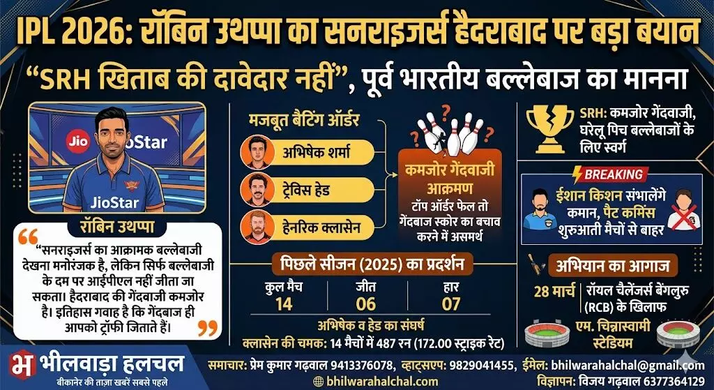 नई दिल्ली । इंडियन प्रीमियर लीग (IPL) 2026 के आगाज से पहले क्रिकेट जगत में भविष्यवाणियों का दौर शुरू हो गया है। पूर्व भारतीय बल्लेबाज रॉबिन उथप्पा ने सनराइजर्स हैदराबाद (SRH) की संभावनाओं को लेकर बड़ा बयान दिया है। उथप्पा का मानना है कि भले ही हैदराबाद का बल्लेबाजी क्रम कागजों पर मजबूत दिखे, लेकिन टीम का कमजोर गेंदबाजी आक्रमण उन्हें खिताब जीतने से रोक सकता है।